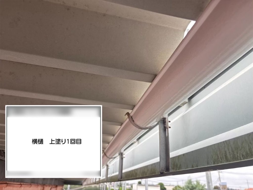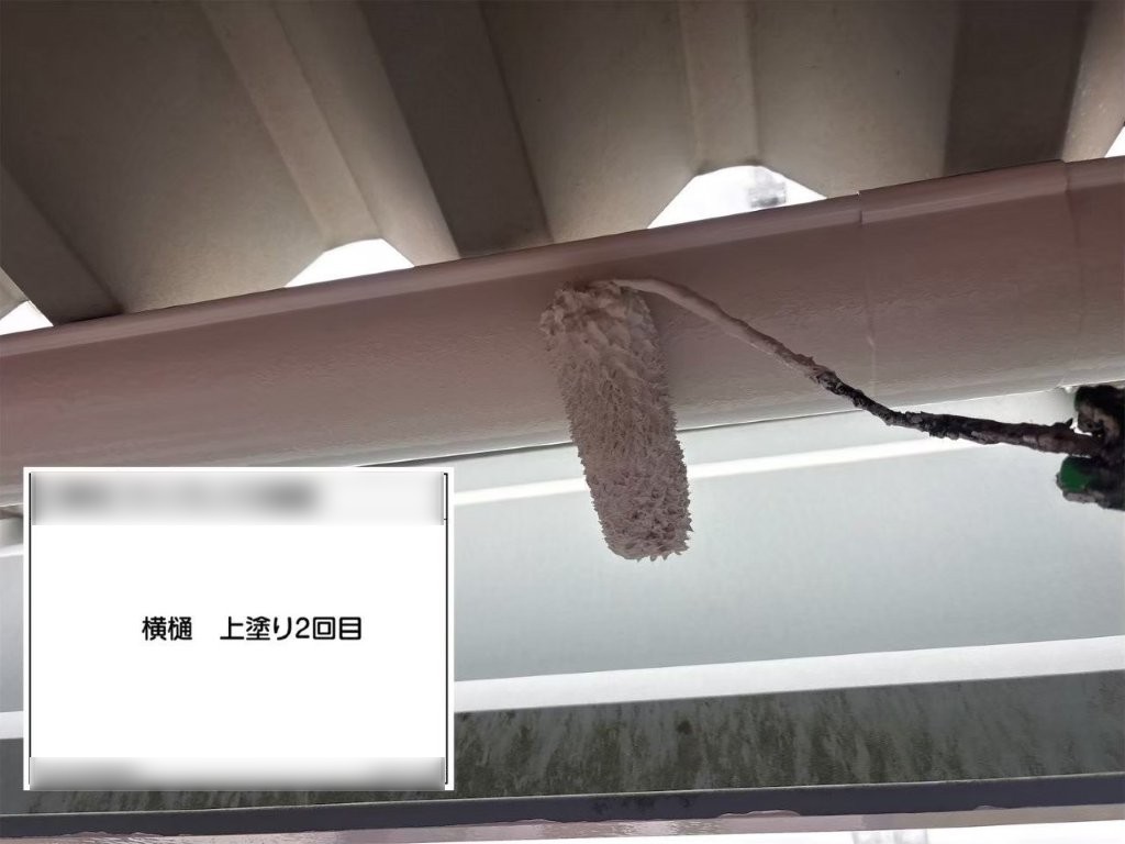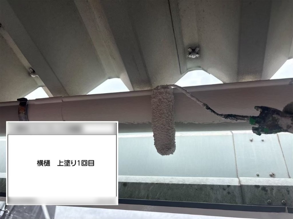 ローラーの圧や転がし方を調整しながら、雨樋全体に均一な塗膜が形成されるよう、丁寧に施工しました。